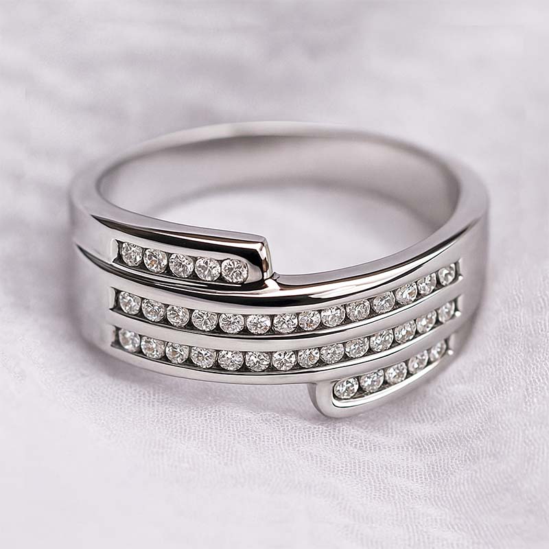 این حلقه با الهام از سبکهای مدرن و کلاسیک طراحی شده تا بتواند در عین سادگی، جلوهای خاص به دستان شما ببخشد. سطح صیقلی و براق نقره، همراه با نگینهای کار شده به صورت دقیق و هنرمندانه، نمایی لوکس ایجاد کرده و آن را برای هر سلیقهای جذاب ساخته است.